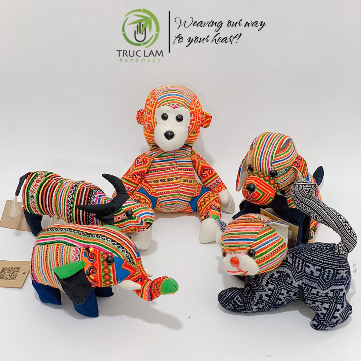 Giới thiệu sản phẩm Đồ Chơi Cho Bé Thú Nhồi Bông Hình Con Khỉ, Trâu, Voi, Chó, Mèo Vải Thổ Cẩm Dệt Tay Bông Gòn Cao Cấp – Trúc Lâm Handmade