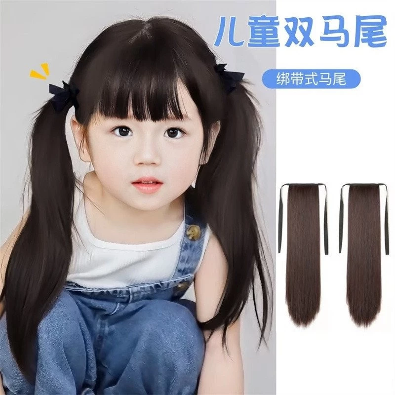 🔥 Nhà sản xuất Hàng sẵn có Trẻ em Tóc giả Đuôi ngựa Bé gái buộc dây Đôi đuôi ngựa Mô phỏng tự nhiên Dài thẳng Tóc giả mảnh Ai đang giảm giá!